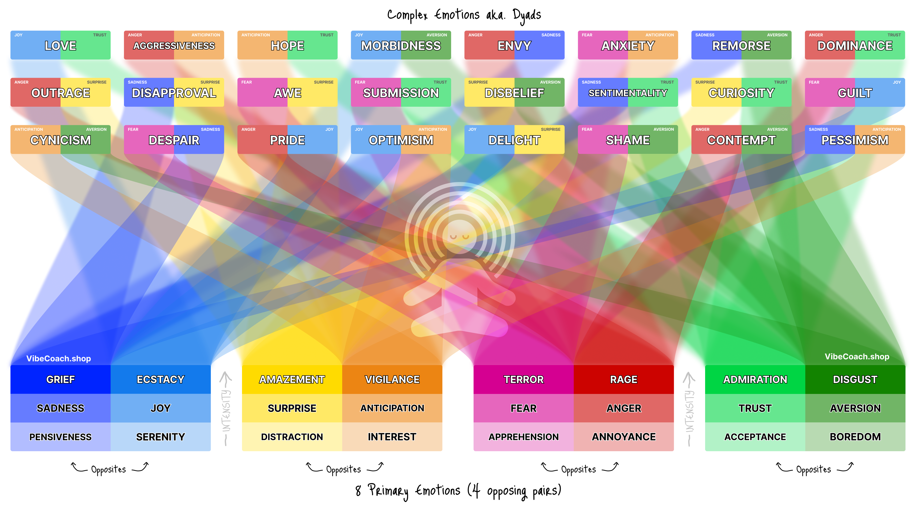Developed from Robert Plutchik's revolutionary "Wheel of Emotions," our Periodic Table of Emotions takes a step beyond traditional models that often limit the understanding to just six basic emotions. Our table incorporates eight foundational emotions, providing a more expansive and modern approach to emotional awareness. This innovative model is designed to help you understand and articulate your feelings with greater precision, ultimately enhancing your emotional intelligence and fostering personal growth.